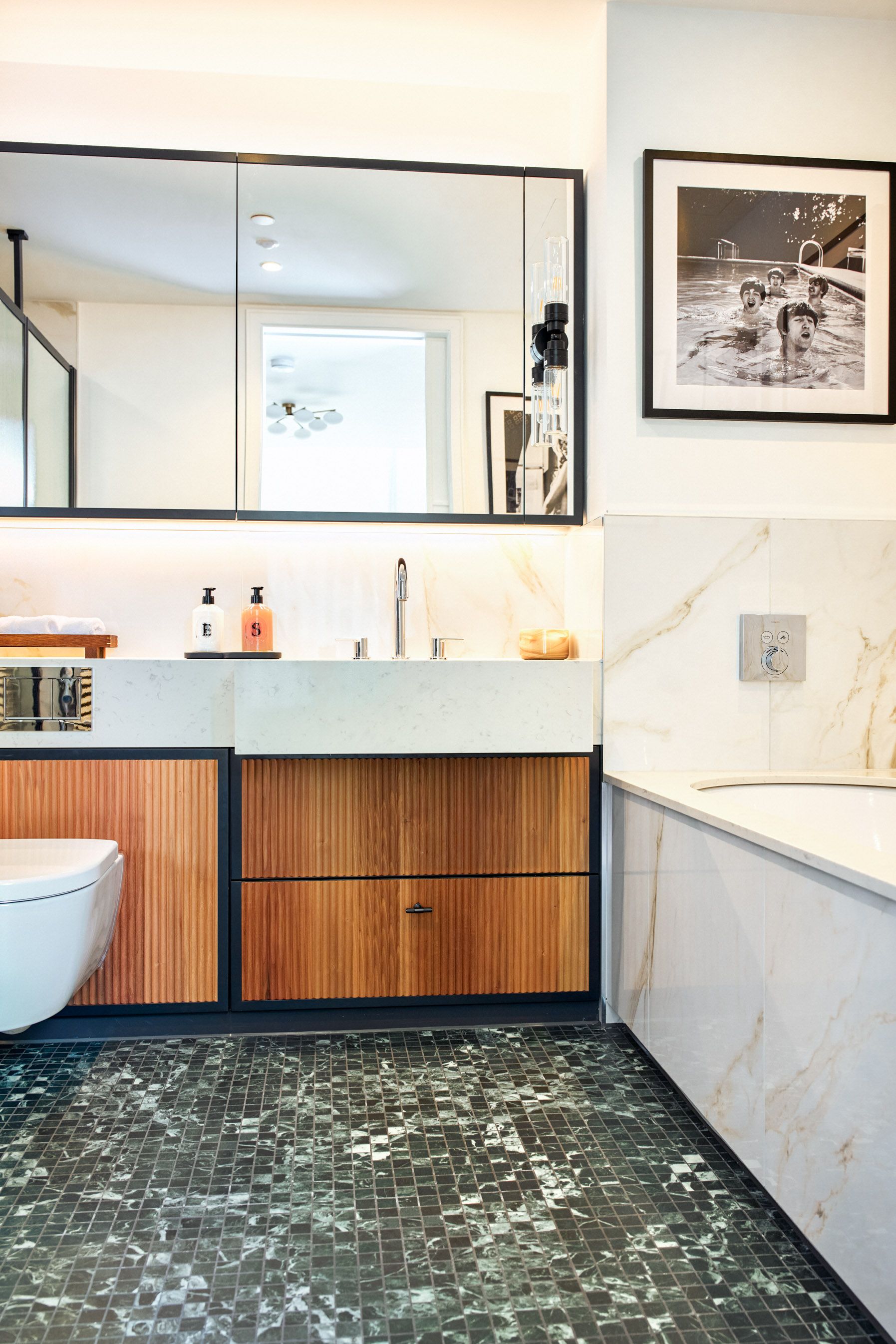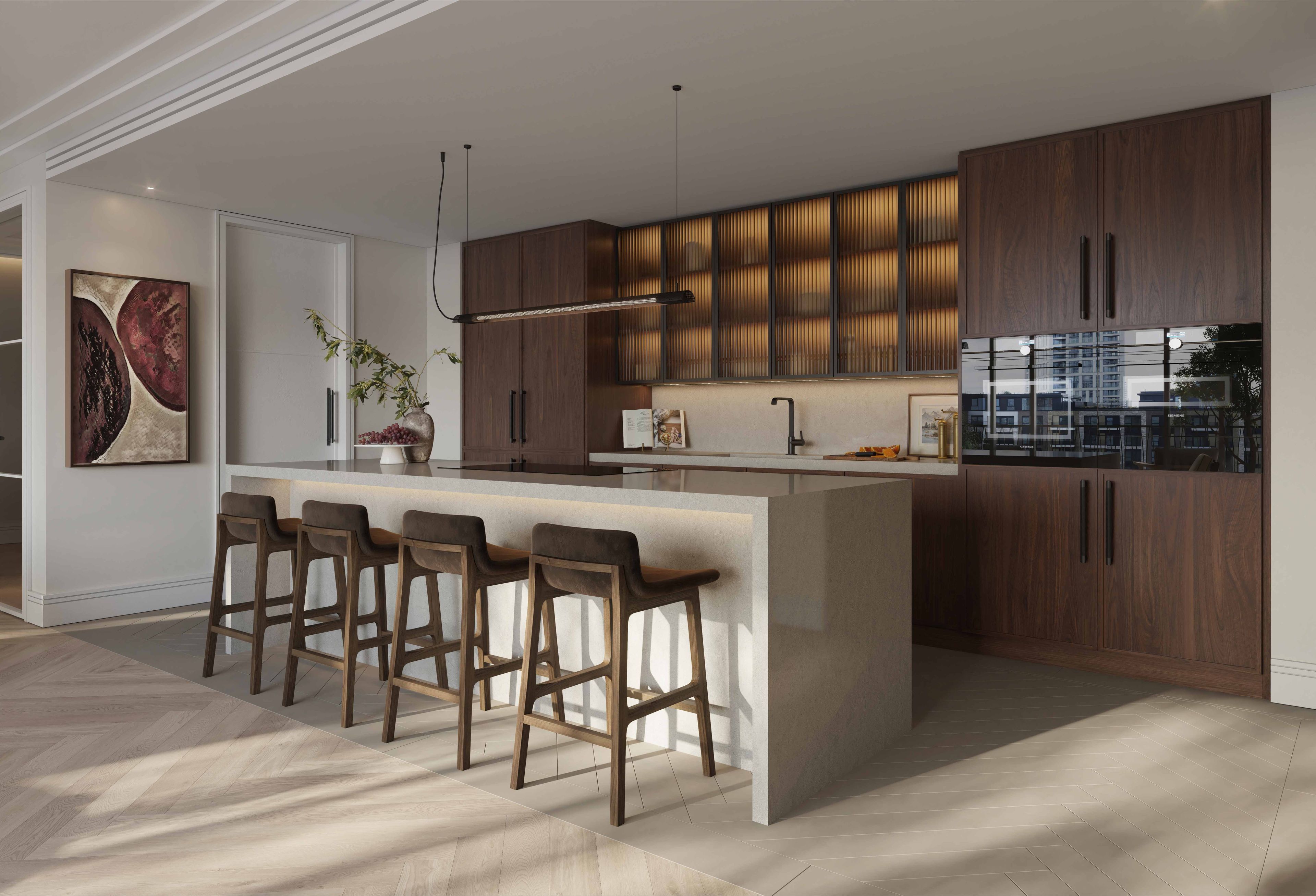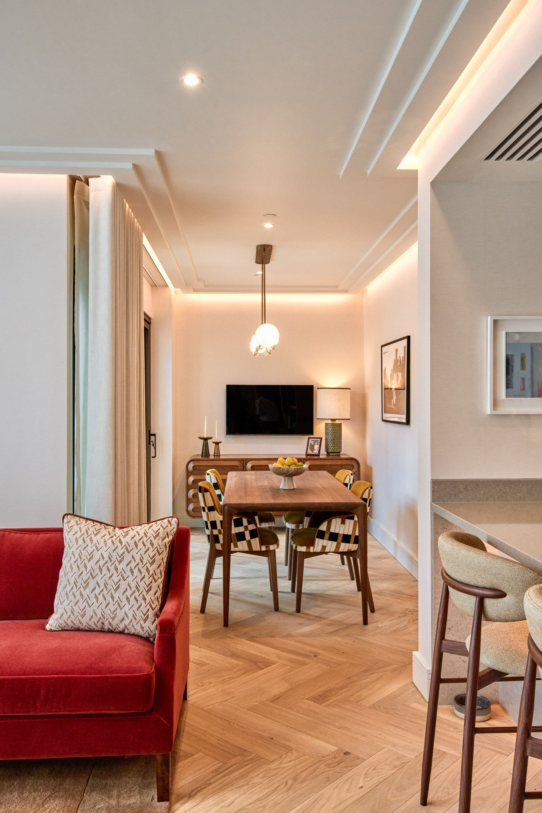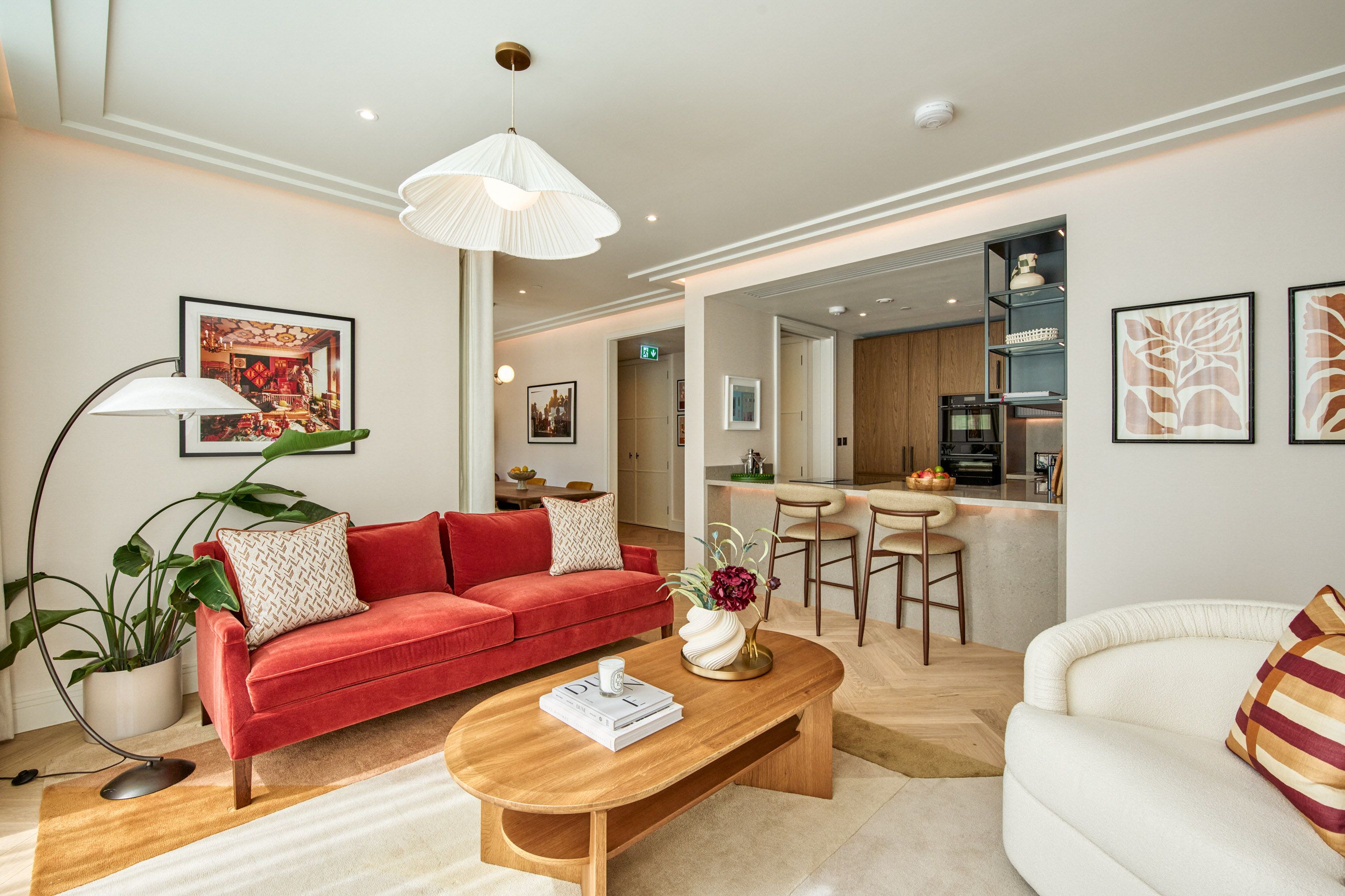 Your open-plan kitchen and living room form the heart of your home, ready for cooking, dining, relaxing and entertaining. Engineered wood flooring and generous windows enhance the refined feel. The well-equipped kitchen comes with fully integrated appliances, including an electric hob, multifunction oven, fridge/freezer and a Fisher & Paykel double-drawer dishwasher.