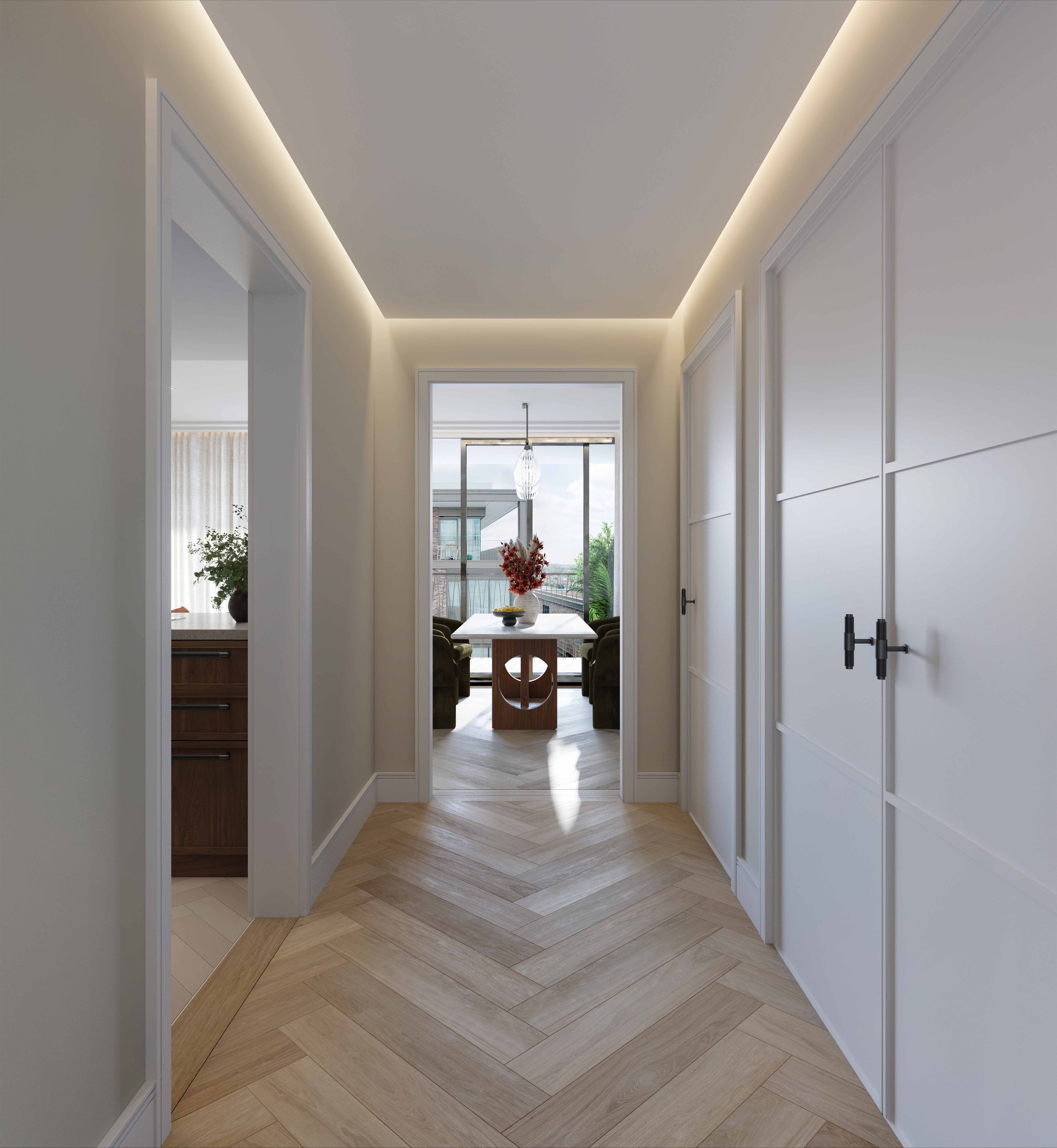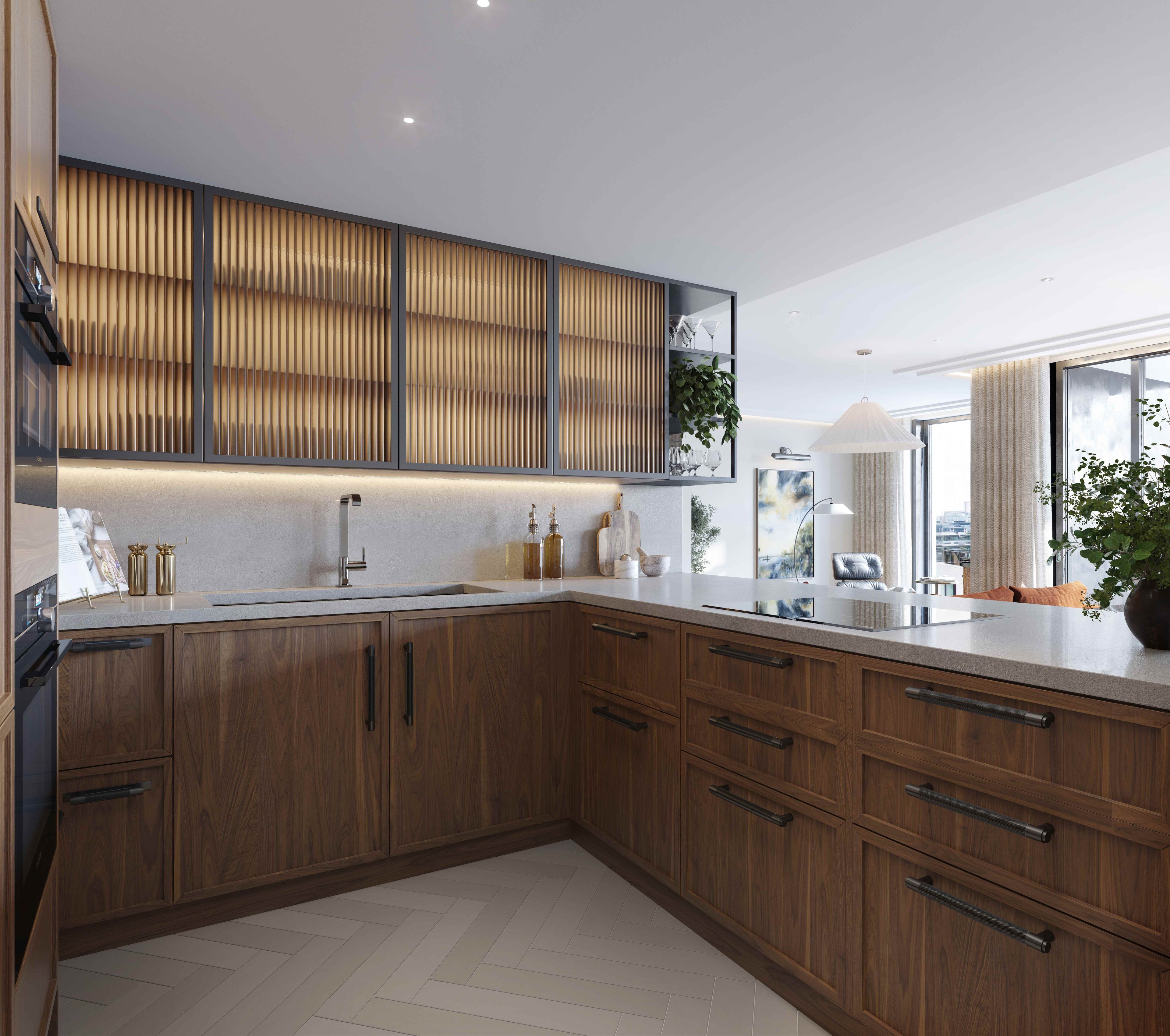 Ideal for cooking, dining, relaxing and hosting, an open-plan kitchen and living room forms the heart of your home. Engineered wood flooring and generous windows enhance the refined feel. The kitchen is equipped with fully integrated appliances, including an electric hob, multifunction oven, fridge/freezer and a Fisher & Paykel double-drawer dishwasher.