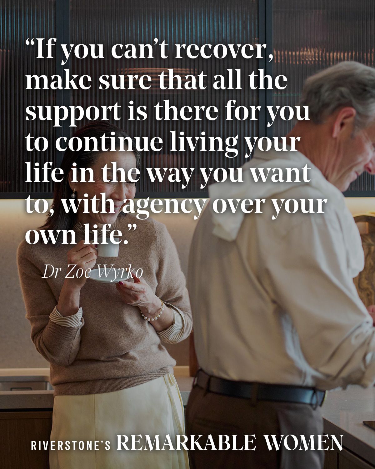 Really, wellbeing is about preventing frailty and helping people understand about what getting older and what ageing means. It’s not about doctors and being ill. It’s about staying as well as possible. The worst will happen, we are not magic. When it does happen, how can you be in the best place to deal with it to give yourself the best chance of recovering? Or, if you can’t recover, make sure that all the support is there for you to continue living your life in the way you want to, at the place you want it to, with agency of your own life. What I’ve done with the wellbeing at Riverstone is really put all of that in place for people. So it’s not in your face, it’s there if you need it. And if you really do need it, it’s there to wrap around you.