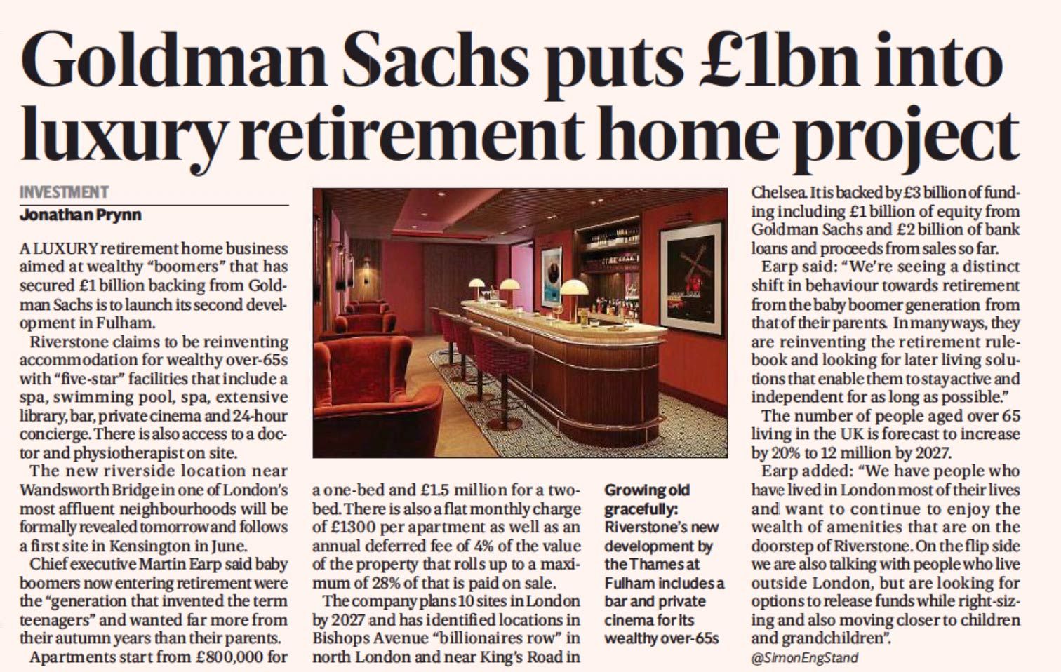 A luxury retirement home business aimed at wealthy “boomers” that has secured £1 billion backing from Goldman Sachs is to launch its second development in Fulham.