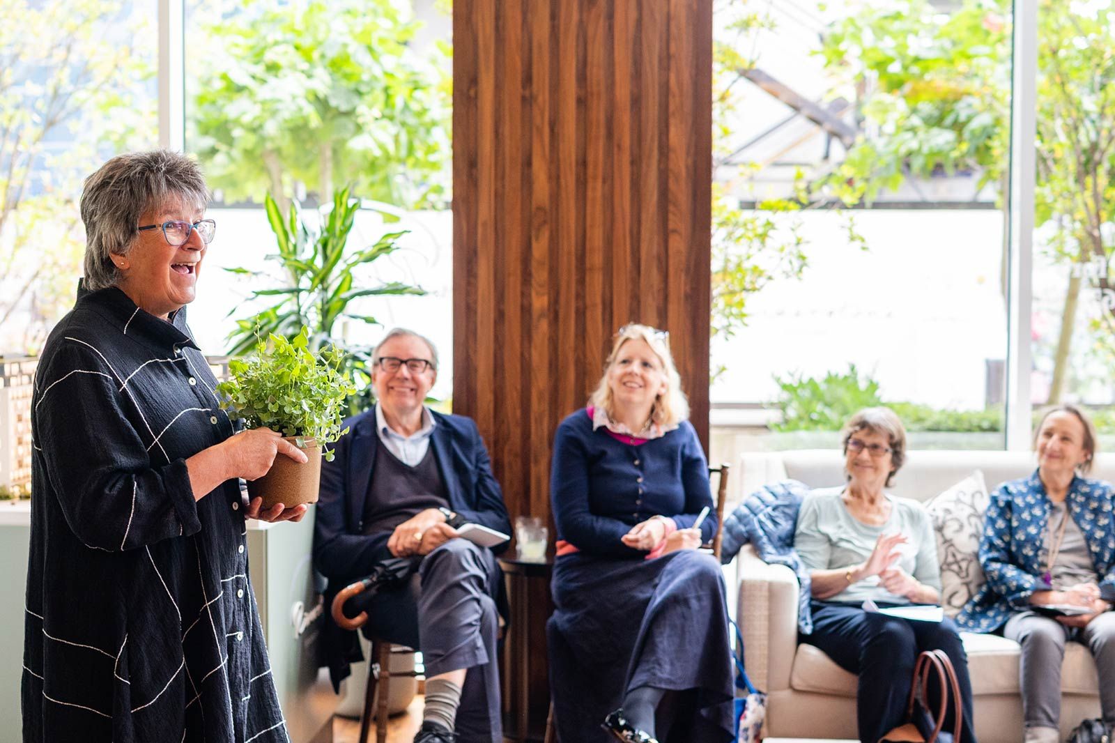 Guests gathered in the beautiful, light-filled space for Jekka to showcase a variety of herbs, including more unusual varieties such as Greek basil and lemon sorrel, including smelling and tasting the herbs to appreciate their full, rich impact on the senses.