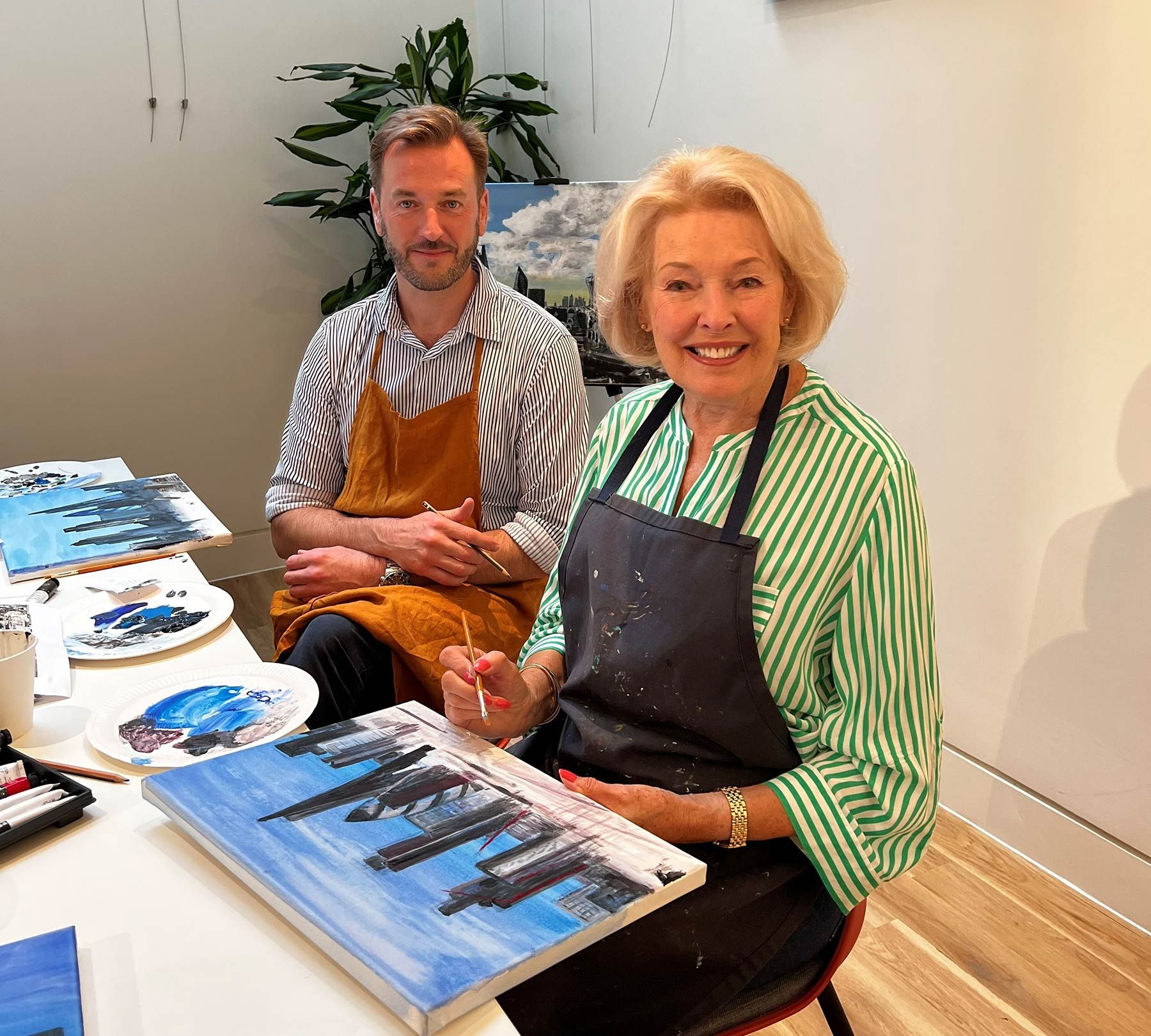 Riverstone held an exclusive workshop for guests of all artistic levels with Diana Moran BEM and our Community Manager Richard Tait, as they introduced the art of urban landscape painting in our creative space, The Harnsa, at Riverstone Kensington. The art workshop was fully equipped with canvases, aprons, brushes and acrylic paint for guests to paint their own urban London landscape. Richard guided guests in three stages, beginning with painting the canvas blue to represent the London sky, creating an outline of the city and filling in the buildings with their preferred colours. Each guest created a talented and personal piece that they chose to either take home or return to retouch, as The Harnsa is always open for moments of creativity.